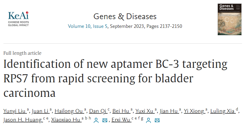 胡小晓课题组也通过X-aptamer技术进行细胞筛选获得一条膀胱癌特异性的核酸适体BC-3,初步考察其性质并鉴定其靶标为RPS7。核糖体蛋白的异常表达可诱发肿瘤等疾病的发生,因此通过分子探针识别或靶向RPS7可以针对膀胱癌提供一种新的诊断和治疗途径。相关研究论文“Identification of new aptamer BC-3 targeting RPS7 from rapid screening for bladder carcinoma”在《Genes & Diseases》期刊(生物化学与分子生物学,Q1)上发表,yl23455永利官网为第一作者单位,yl23455永利官网博士研究生刘匀毅为文章的第一作者,Erxi Wu教授和胡小晓副教授为共同通讯作者。以上研究均由国家科技部项目、国家自然科学基金、长沙市自然科学基金等支持。